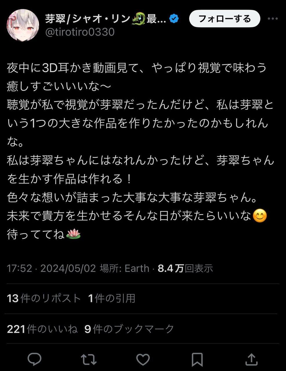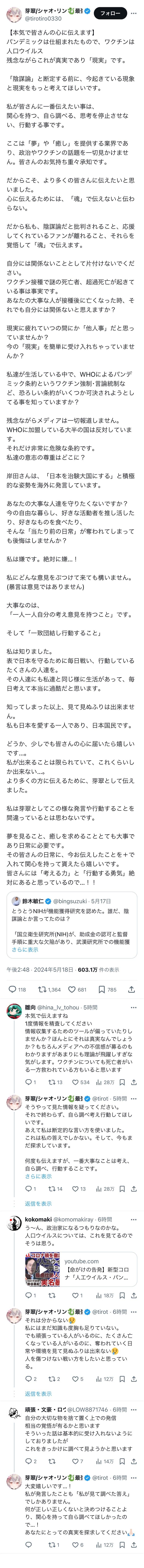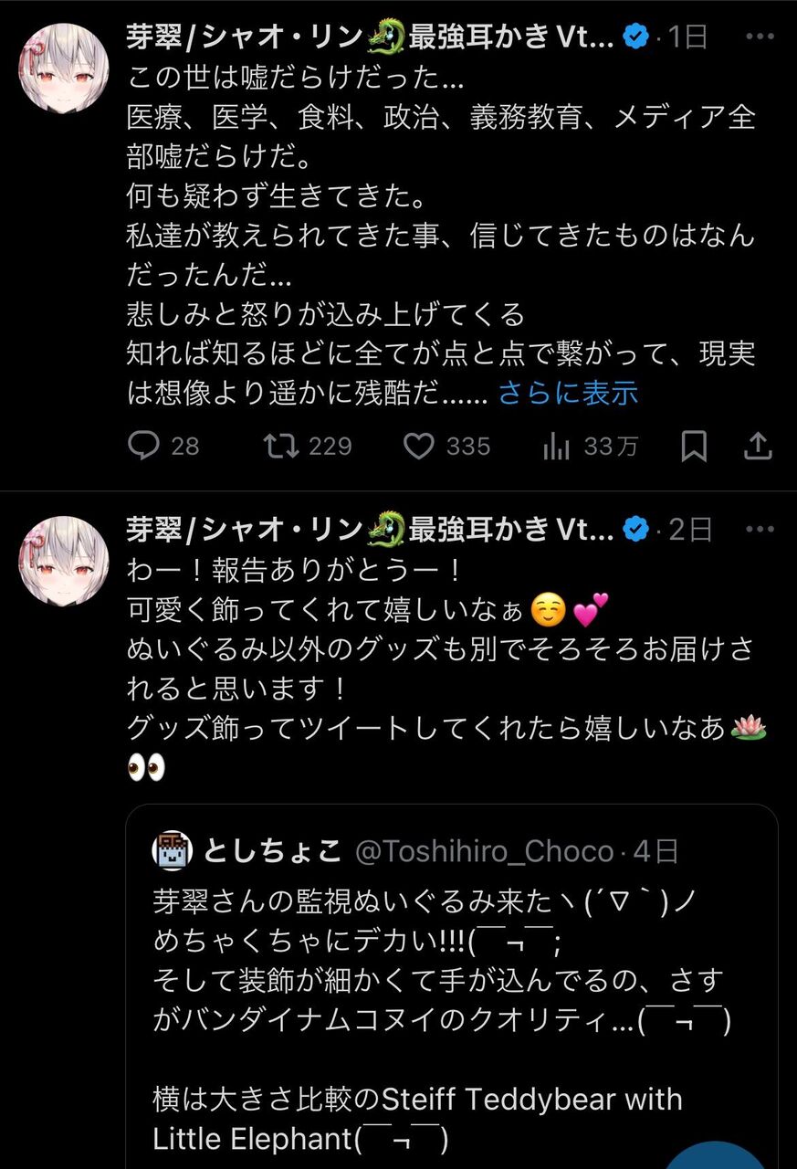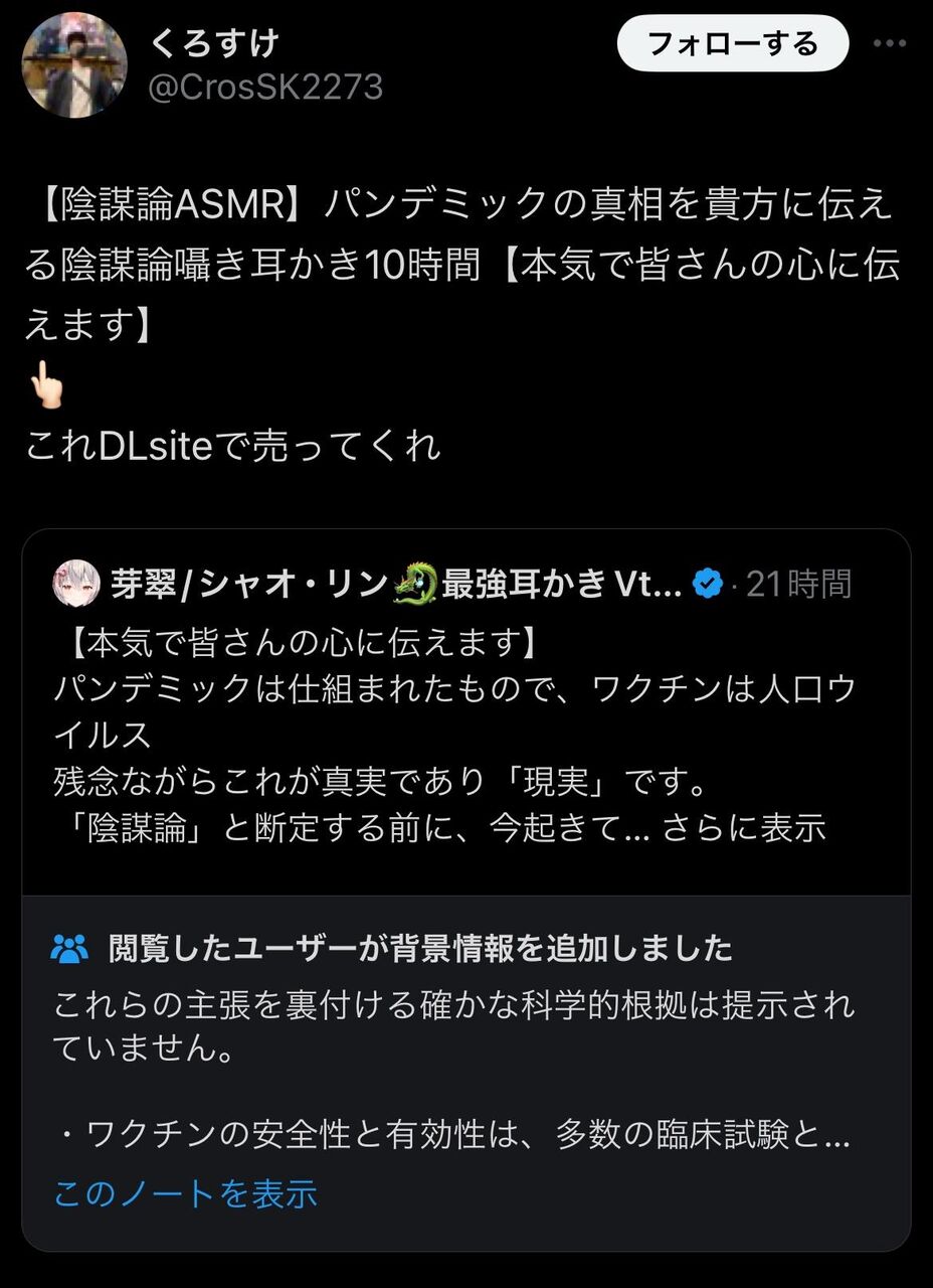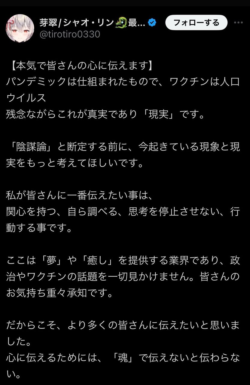 「本当に残念ですね。ASMR系のVチューバーさんの活動を楽しみにしていたファンの一人として、彼が反ワク陰謀論者となる姿を見るのは本当にショックです。」