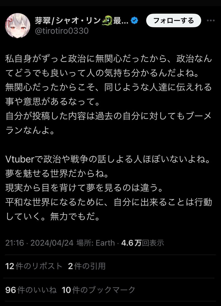 でも根は良い子みたいだな、選挙にいかなかったし政治に興味が無さ過ぎたから後悔しててみんな選挙に行こうって促してたし政治や世の中を考える若者が少ないのは確かだから