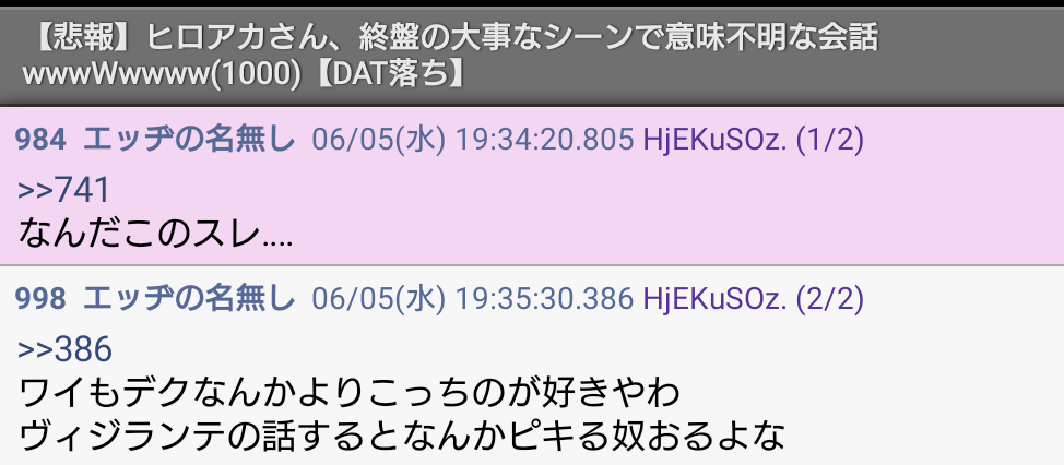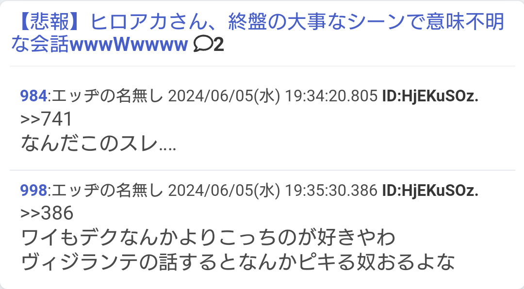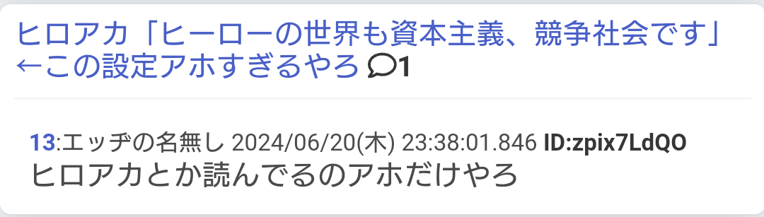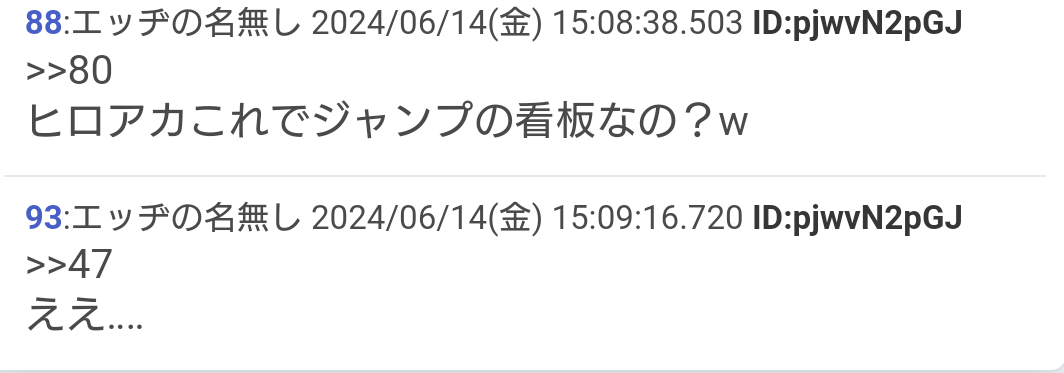 ・ヒロアカアンチきもいよなってレスに脊髄反射して、自分はブリーチ信者の*ですと正体明*オツム具合