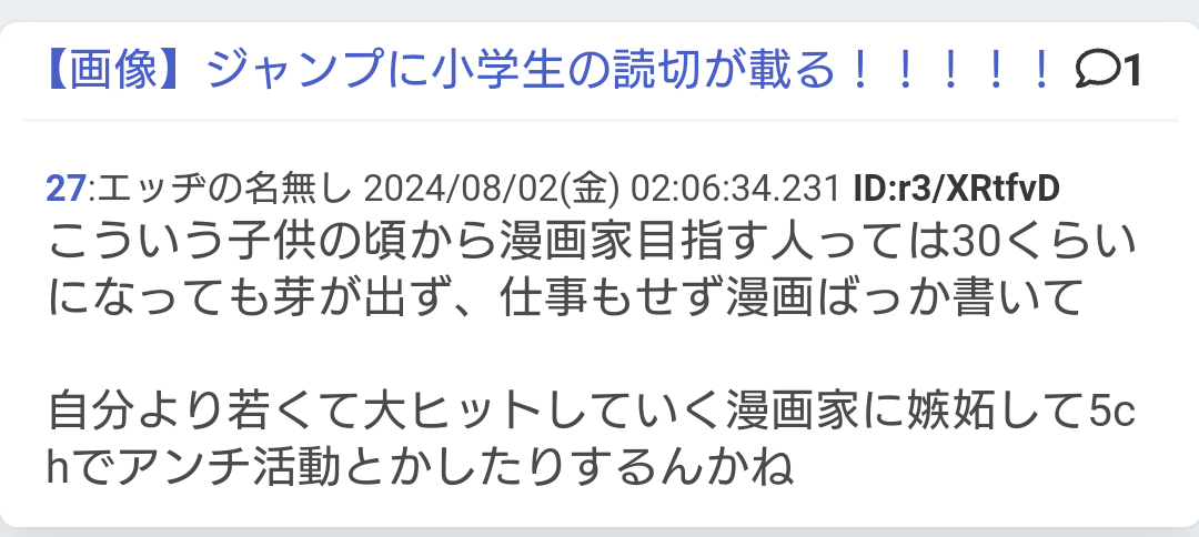 ・ジャンプ読切の小学生相手に、将来自分より年下の漫画家のアンチになるぞとかいう実体験のようなレス